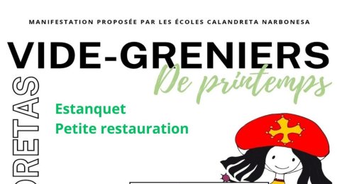 Nous vous invitons à participer à notre grand vide-grenier organisé devant l’école de la Granhota (Calandreta Narbonesa), Impasse Robert Lafont - Infos pratiques : • Date : Dimanche 31 mai 2026 • Emplacement : 4 mètres = 10 € - Inscription en ligne : https://drive.google.com/file/d/1uB8IBHr18UG0CxunpjuA4NN0cTGIWVnj/view - Inscription papier : Dossier à compléter et à déposer avant le 30 mai 2026 : • À l’école Calandreta Narbonesa Granhota (Impasse Robert Lafont) • Ou à Jaquetona (ancienne caserne Montmorency, 50 Av. Général Leclerc) - Contact : videgreniercalandretanarbonesa@gmail.com - Venez vendre, chiner et passer un moment convivial en famille ou entre amis ! On vous attend nombreux